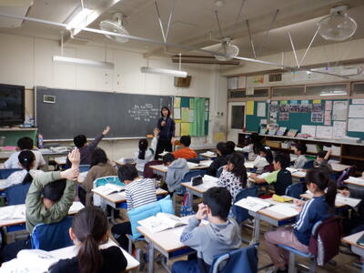 4年生: 「 How many letters ? 〇 letters.」を使って、ローマ字にした名前の文字数を尋ね合いました。