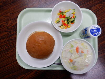 2学期最後の給食でした。今日のメニューは、チキン竜田サンド、クリスマスサラダ、クリームシチューでした。チキンでクリスマス気分を味わい、サラダでクリスマスカラーを楽しみ、クリームシチューで心身を温めました。正規の調理員さん、栄養士さんです。2学期も、安全で楽しくおいしい給食をありがとうございました。