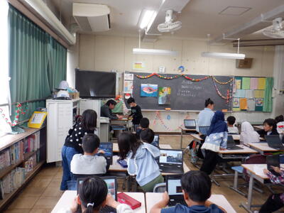 5年生: 「自然環境を守るために」です。森林減少や海洋汚染等、各自のテーマについて調べています。