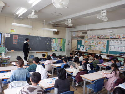 1年生: 「ずをかこう」です。いすが8こで12人いる時、座れない人の人数を図をかいて求めました。