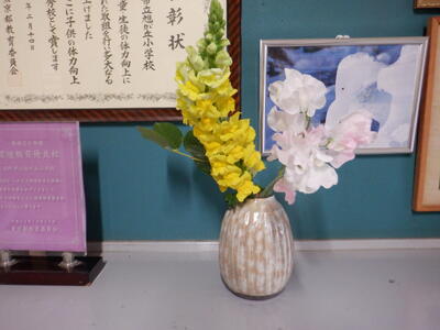 地域の方による生花「きんぎょ草、桃」です。早春にぴったりな花空間をありがとうございました。