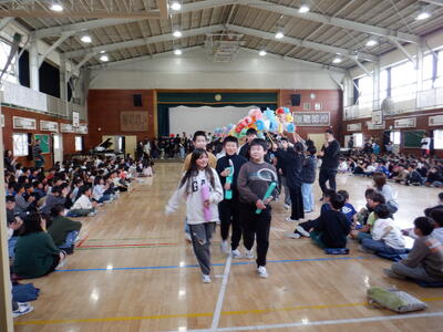 1年生: 6年生、好き!が続く「好き過ぎて滅!」の呼び掛けの後、花飾りのプレゼントをしました。