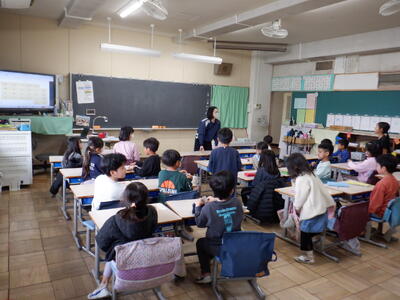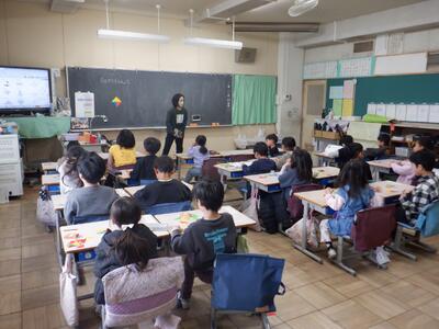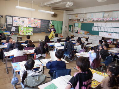 3年生: 「What's this?」です。スリーヒントで問題を出し合い、最後に正解の絵を見せていました。