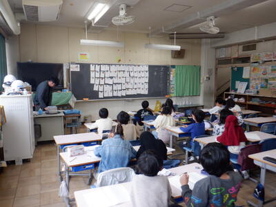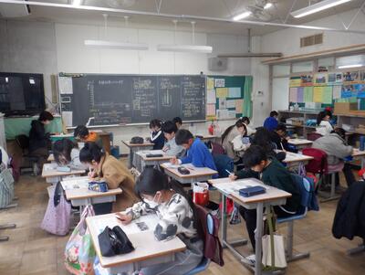 1年生: くじ引きによる「席替え」です。新しい席から黒板の字が見えるかどうか、確かめています。
