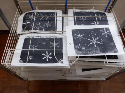5年生: 「雪の結晶」です。黒インクを塗った原版から紙をはがすと、白い結晶の作品ができました。