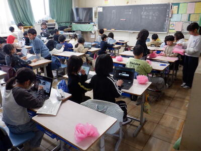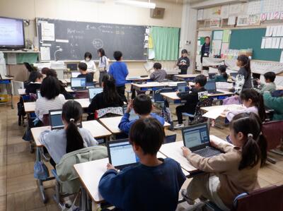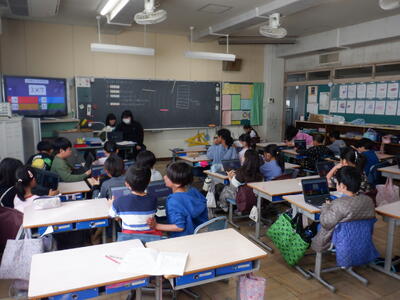 4年生: 「調べて話そう 生活調査隊」です。発表を聞きた感想を Google Forms に打ち込んでいます。