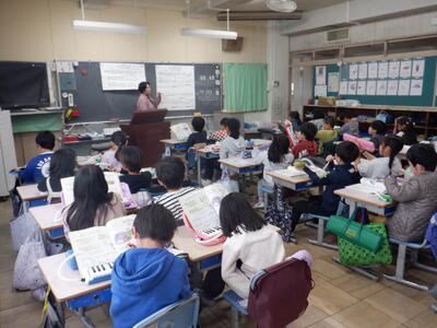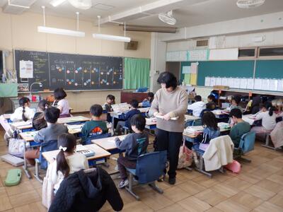 2年生: 「こぐまの二月」です。主旋律と低音の2パートに分かれて鍵盤ハーモニカを演奏しました。