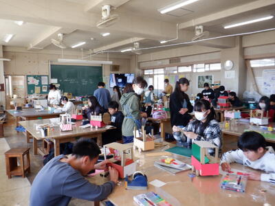 6年生: 「屋台を作ろう」です。紙粘土と絵具を使い、本物そっくりなクレープ等を作っていました。