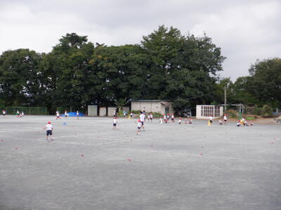 5年生: バトンパスの練習です。後ろを振り返らずに、加速しながらバトンを受け取る練習をしました。