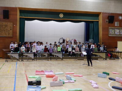 6年生: 音楽会の学年練習です。正確なリズムと音の強弱を調整し、さらに完成度を高めていました。