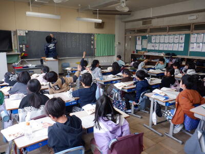 6年生: 「鶴亀算」です。グループで協力して、頭が10個、足が28本のときの鶴の数を求めました。