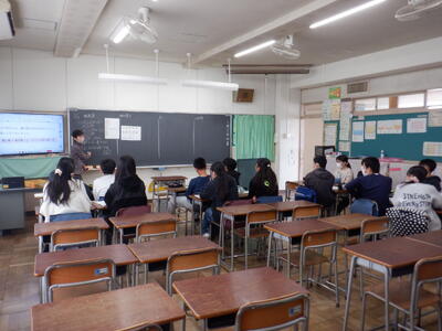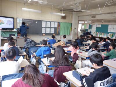 「災害体験者から学ぶ」です。教員の代表が東日本大震災(2011.3.11)の体験を語りました。子供たちは真剣な表情で話を聞いていました。災害時の行動や日常の対策等を学ぶ、よい機会となりました。