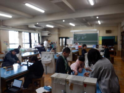 6年生: 「くらしと電気」です。手回し発電機を使って、豆電球や発光ダイオードを点灯させました。