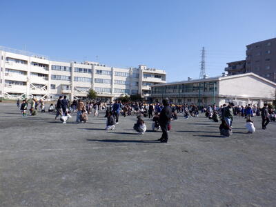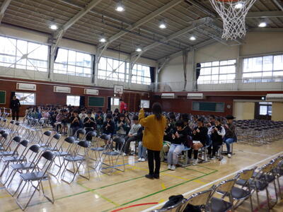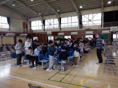 ゲーム集会で「進化ゲーム」を行いました。同じ動物同士でジャンケンし勝ったら、カエル→ウサギ→サル→人間の順に進化します。開始とともにどんどん進化し、最後は約1/3の人が人間になりました。集会委員の皆さん、今年度も楽しい集会の企画運営をありがとうございました。