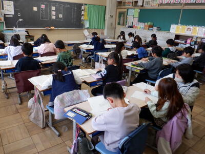 3年生: 「漢字の復習」です。漢字50問テストに向けて、復習プリントで一生懸命練習しています。