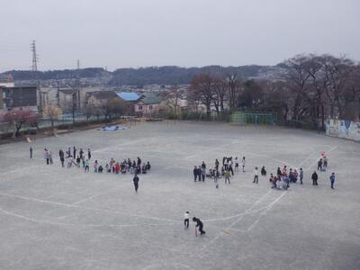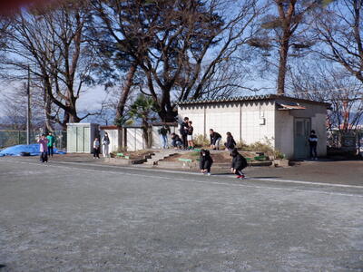 1年生: 「ふゆをさがそう」です。校庭でいろいろな冬(息の白さ、池の氷、霜柱など)を探します。