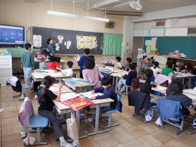 1年生: 「ずをかこう」です。いすが8こで12人いる時、座れない人の人数を図をかいて求めました。