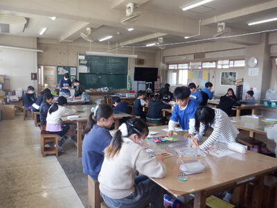1年生: 「入学式の出し物の練習」です。新1年生に、学校の楽しさが伝わるように頑張っています。