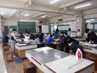5年生: 「ティッシュケース作り」です。ミシンを使い、縫い始めと終わりに返し縫いをしています。