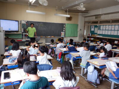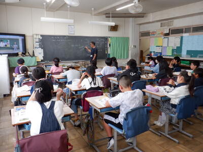 2年生①:夏休みの宿題の確認です。モニターで〇✖クイズに答えながら、宿題の内容を確かめています。