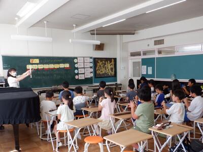 1年生: 「おとのしりとり」です。鍵盤ハーモニカで、小節の最初の音をはっきり出す練習をしました。