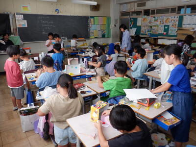 2年生: 夏休みの思い出の絵を描きます。花火やお祭りなど、いろいろな思い出の発表がありました。