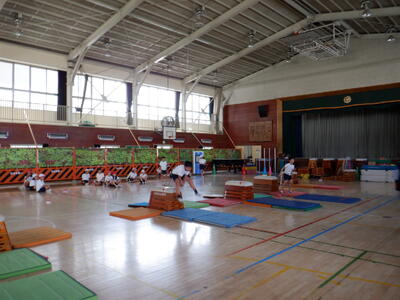 2年生: 「跳び箱運動遊び」です。両足で踏み切って跳び、次の人に「いいよ。」の合図を送りました。