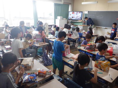 2年生:図工「ともだちハウス」です。空き箱を並べたり、積み上げたりしてオリジナルの家を作りました。