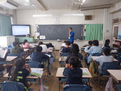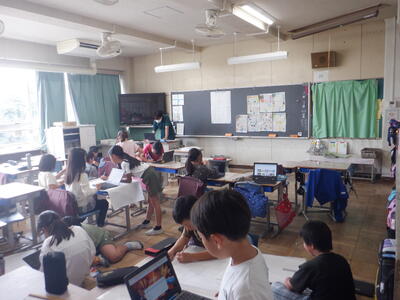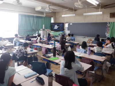 4年生:「星や月」です。動画を見て、時間が経つと、半⽉の位置はどのように変わるかの関心を高めました。