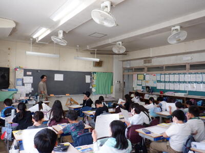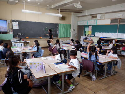 5年生: 跳び箱運動の振り返りです。学習カードに前回の開脚跳びの反省と次回のめあてを書きました。
