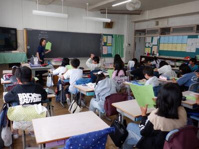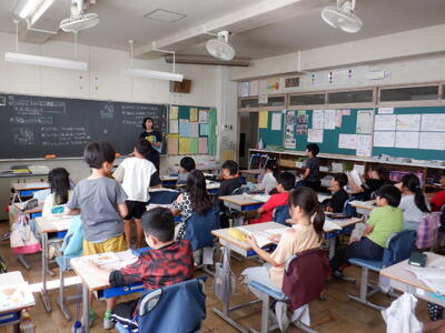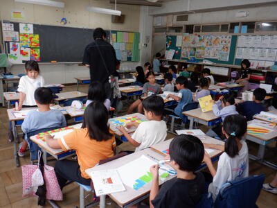 4年生: 東京都の地図を見て、市区町村名を書きました。裏の答えを参考に、正しく記入していました。