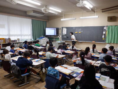5年生: 「部品はどこから」です。完成した車が船やキャリアカーで運ばれる長所と短所を考えました。
