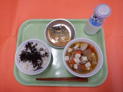 麦ごはん ひじきのふりかけ さばの味噌煮 けんちん汁 牛乳