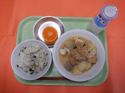 菜飯 肉みそおでん 菊花みかん 牛乳