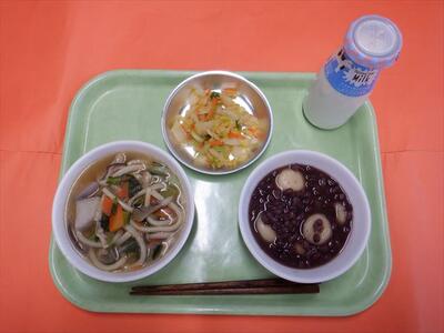 煮込みうどん お汁粉 白菜の変わり漬け 牛乳