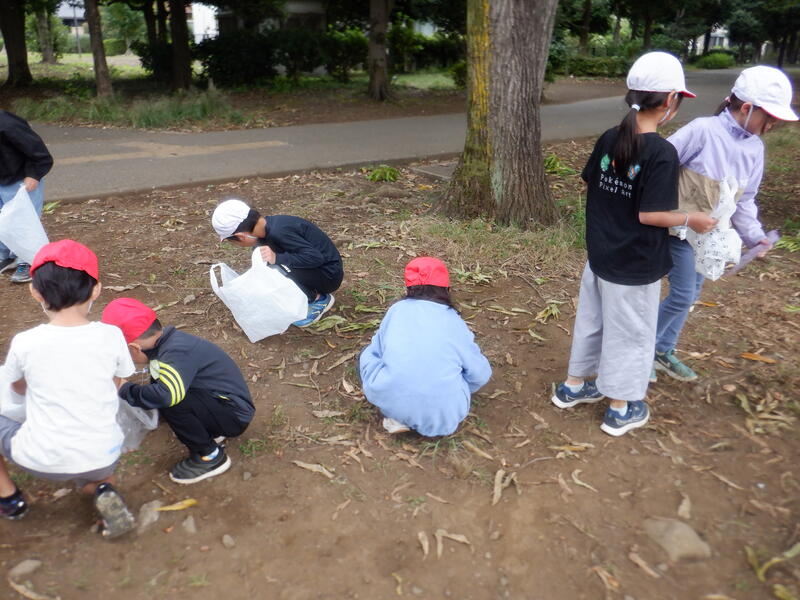 午前中はウォークラリーを行いました。「色がまざった葉っぱを見付けよう」「まるいどんぐりを見付けよう」という秋らしいミッションや「じゃんけん大会をしよう」などのお楽しみミッションなどを縦割り班で楽しみました。落ち葉やどんぐりを夢中で拾う姿がたくさん見られました。