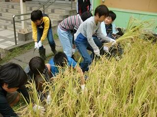 5年生全員で、稲刈りをしました。慎重にカマを使いながら、丁寧に刈り取りました。