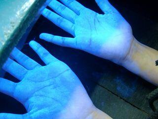 ブラックライトにあてると、洗い残しの部分がわかります。