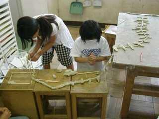 材料は、粘土、0.5~1cm程度の角材、籐、紙バンドなどです。