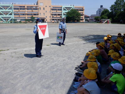 警察の方と一緒に、信号機の色の意味を確認しました。青になってもすぐに渡らず、右→左→右の順に車が来ていないか確認し、ドライバーの方から見えるようにしっかり手を挙げて渡ることを教えていただきました。実際に外に行き、横断歩道を渡ると、一人一人が教えていただいたことを実践することができました。自分の命は自分で守るという意識を大切にして、安全に登下校してほしいと思います。