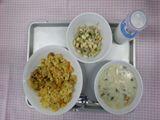 ジャンバラヤ・もやしと大豆のあえもの・白菜のクリームシチュー・牛乳