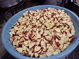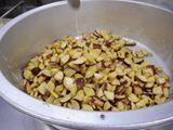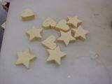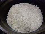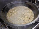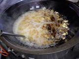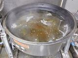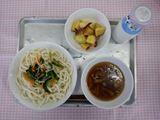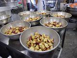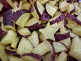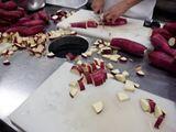 *今日は、ミルキーポテトです。作り方を紹介します。さつまいもを切り水につけます。なべに牛乳、生クリーム、砂糖を入れてタレを作ります。目安はトロッとするくらいです。焦げやすいので注意します。水につけたさつまいもをざるにあけて水気を切り、油で揚げます。揚げたさつまいもにタレをからめて出来上がりです。今日は、調理員さん作ラッキーさつまいもの登場です!