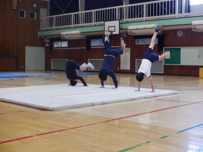 6年生の体育では、曲に合わせて自分たちで技を選ぶ「シンクロマット」を行っています。