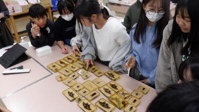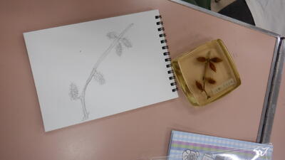 また、樹脂で固めた動物(昆虫、節足動物など)や植物をスケッチしたり、3D電子顕微鏡写真を3Dメガネを使って観察しました。