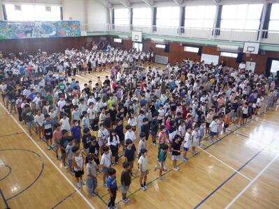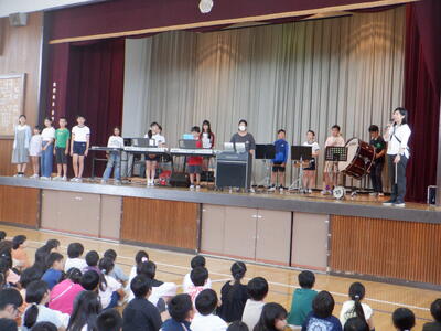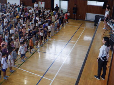 今日の音楽集会では運動会の閉会式で歌う校歌を練習しました。
