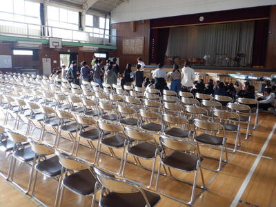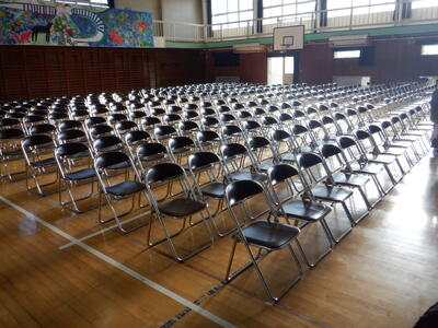 体育館の床を拭き、全員で協力して椅子を並べ、そしてその椅子をしっかりと拭きました。