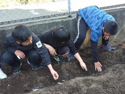 今日は環境ボランティアの皆様の協力で、5年生がジャガイモの種を植えました。