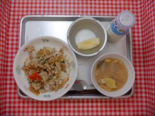 今日は日野産卵を使った親子丼です。鶏肉と卵・そして高野豆腐も入れた親子丼です。だしを吸った高野豆腐がジューシーでおいしいですよ。果物は日野産のりんごです。今日は『ふじ』という品種で、さっぱりとした味わいです。日野の恵みに感謝して、いただきましょう。