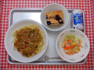 スパゲッティカレーソース・コールスローサラダ・ブルーベリーケーキ・乳酸菌飲料