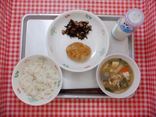 今日は和食の一汁二菜献立です。今日の主菜は【おから入り和風ハンバーグ】です。おからは豆腐を作るときにできる副産物ですが、廃棄されてしまうことが多いです。給食では、市内の豆腐屋さんから食物繊維が豊富なおからを安価で提供していただき、活用しています。今日はひき肉と一緒に、しっとりさっぱりの和風ハンバーグにしました。子供たちもよく食べてくれます。近所のお豆腐屋さんでもおからを手に入れることができるので、ぜひご家庭でもおからを活用してみてはいかがでしょうか。